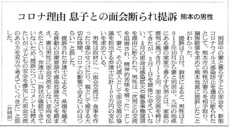 コロナ理由 息子との面会を断られ提訴 熊本の男性 面会交流不履行についての新聞記事 面会交流を不履行にした別居妻とその代理人弁護士を訴えた訴訟について,今日の朝日新聞で取り上げられました。 提訴された弁護士は,「子どもの安全を優先した面会交流のあり方を双方で考えていくべきだ」とコメントしていますが,この弁護士がまともに協議をしようとしなかった誠実協議義務違反も提訴の理由になっています。 そのことも訴訟の中で明らかになっていくでしょう。 カテゴリー: 1,報道タグ: 別居, 子ども, 弁護士, 朝日新聞, 面会交流